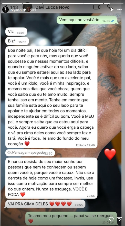 卢卡发给内马尔的信息:爸爸,我知道今天对你和我们来说都是艰难的一天。但我想让你知道,在这些困难时刻,即使没有人站在你身边,我也会一直陪伴着你支持你。你不仅是一位优秀的父亲,更是我的偶像和灵感来源。