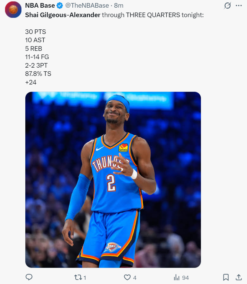 末节雄鹿并没有直接放弃所以SGA再度回归,他无差别单打继续稳住局面,他也完成了40+的得分,